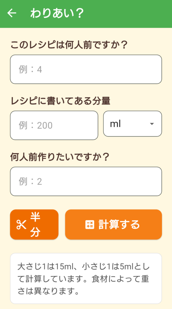 材料の量と単位を入力してから「半分」を押すと、半分の量が表示されます。