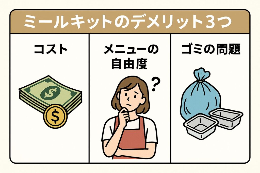 食材ロスの削減というメリットの一方で、食材が個包装されているため、ビニールゴミが増えるというデメリットもあります。