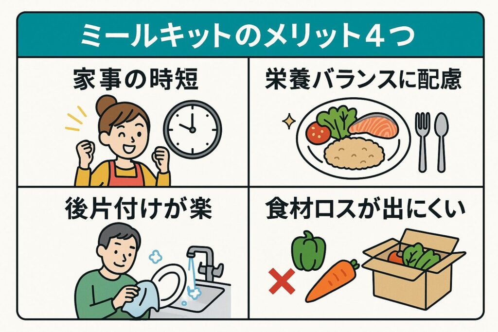 ・献立を考える手間が省けるため、毎日の食事準備が楽になる。
